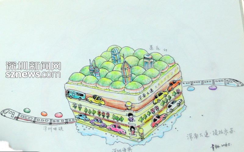 青松告訴記者,2008年剛到深圳時(shí),他就被市民中心的造型所吸引,畫(huà)下了上面這幅畫(huà)