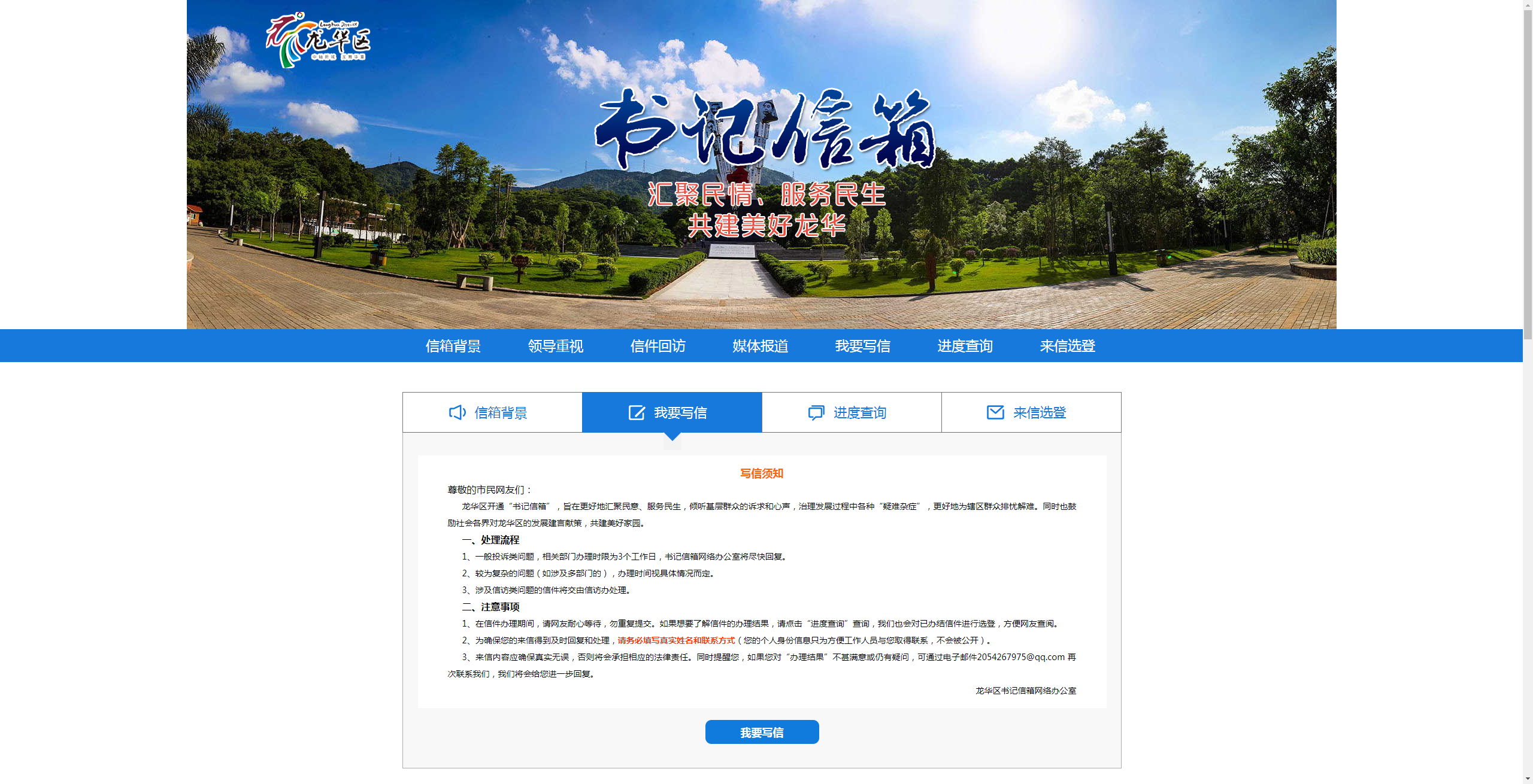 龍華區(qū)“書記信箱”網(wǎng)絡平臺是由龍華區(qū)領導的指導下搭建的網(wǎng)絡信息平臺,由深圳新聞網(wǎng)團隊進行開發(fā)搭建?!皶浶畔洹钡臉嫿?,是龍華區(qū)委貫徹落實黨的群眾路線,踐行“三嚴三實”的一項新舉措?!皶浶畔洹弊?015年10月31日正式上線以來,逐步成為龍華市民向龍華區(qū)委反映、提出建議、意見和投訴請求的重要渠道。