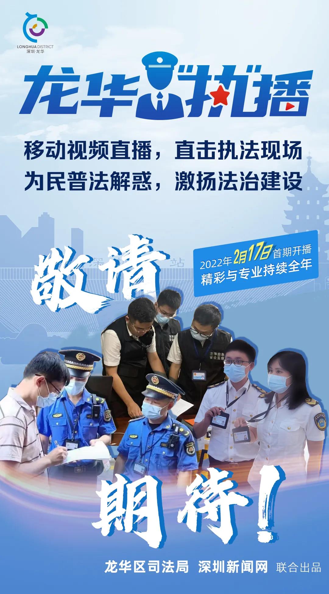龍華“執(zhí)”播是深圳新聞網(wǎng)聯(lián)合龍華區(qū)推出的首檔直播式執(zhí)法行動欄目,是規(guī)范行政執(zhí)法行為、調(diào)動社會力量參與行政執(zhí)法監(jiān)督,豐富普法宣傳渠道的創(chuàng)新舉措,吸引70萬網(wǎng)友參與直播。2022年全區(qū)將至少開展20期“龍華‘執(zhí)’播”行動,邀請人大代表、政協(xié)委員、熱心市民等參與,執(zhí)法全程將進行實時網(wǎng)絡(luò)直播,讓市民“零距離”參與執(zhí)法行動。