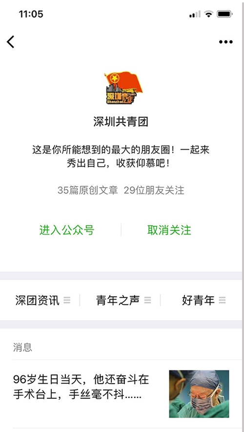 案例介紹:“深圳共青團”微信公眾號于2013年開通,是全省最早開通的政務(wù)微信號。在近兩年加大力度建設(shè)和推廣后,粉絲數(shù)有了飛躍性的增長,推送閱讀量和影響力也有了比較明顯的提升。截至目前,累計推送1700余篇,平均閱讀量1萬以上,單篇最高閱讀量達到36萬,粉絲數(shù)90余萬。目前,公眾號影響力在全國地市級團委中排名前3,在全市政務(wù)新媒體中排名前5。在發(fā)布的內(nèi)容上,主要關(guān)注時政要聞、社會熱點、政策解讀等與青年息息相關(guān)、喜聞樂見的話題內(nèi)容,弘揚愛國精神和時代精神,是深圳共青團聯(lián)系、引導(dǎo)和服務(wù)青年的重要載體。