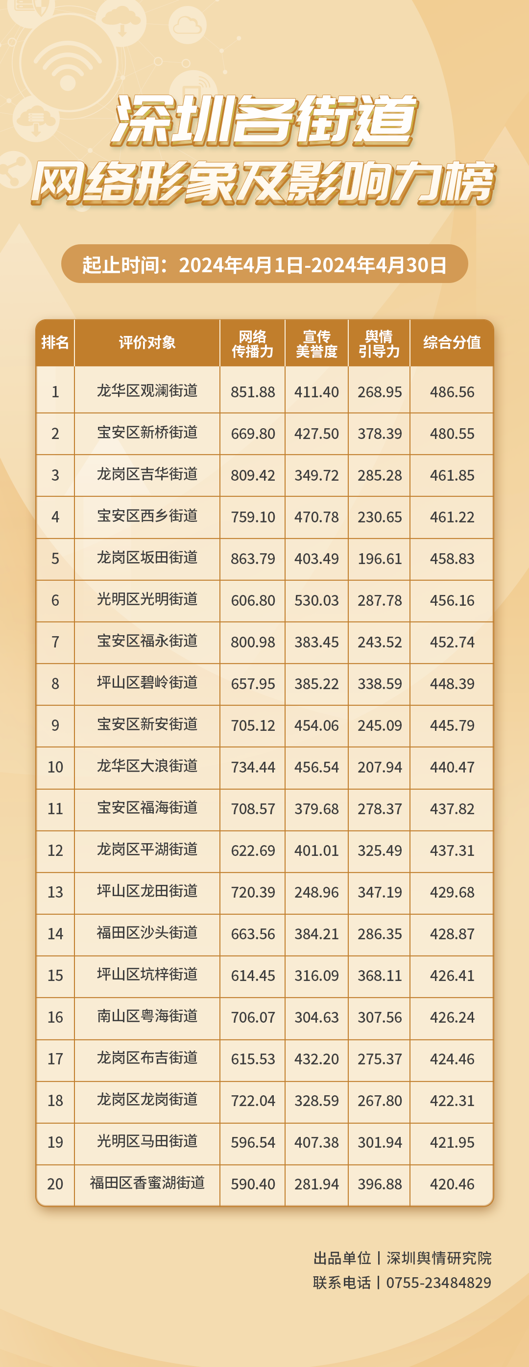 2024年4月,深圳市哪些街道在網(wǎng)絡(luò)形象及影響力塑造方面表現(xiàn)甚佳?讓我們共同關(guān)注。本期榜單數(shù)據(jù)統(tǒng)計(jì)范圍為2024年4月1日至4月30日。
