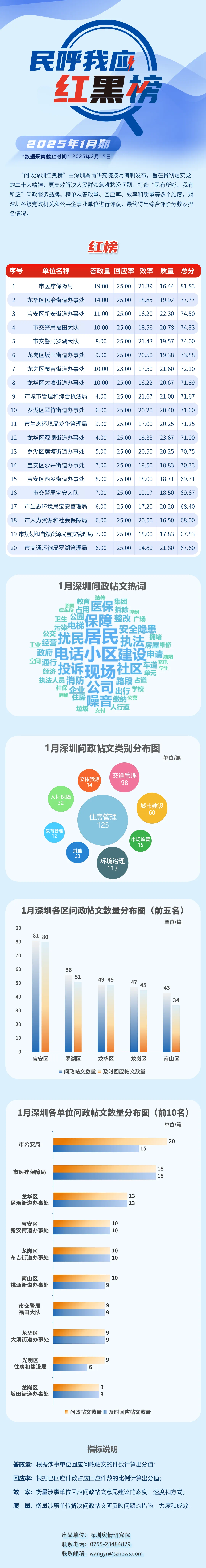 “深圳民呼我應(yīng)紅黑榜”由深圳輿情研究院按月編制發(fā)布,旨在貫徹落實(shí)黨的二十大精神,更高效解決人民群眾急難愁盼問(wèn)題,打造“民有所呼、我有所應(yīng)”問(wèn)政服務(wù)品牌。榜單從答政量、回應(yīng)率、效率和質(zhì)量等多個(gè)維度對(duì)深圳各級(jí)黨政機(jī)關(guān)和公共企事業(yè)單位進(jìn)行評(píng)議,最終得出綜合評(píng)價(jià)分?jǐn)?shù)及排名情況。