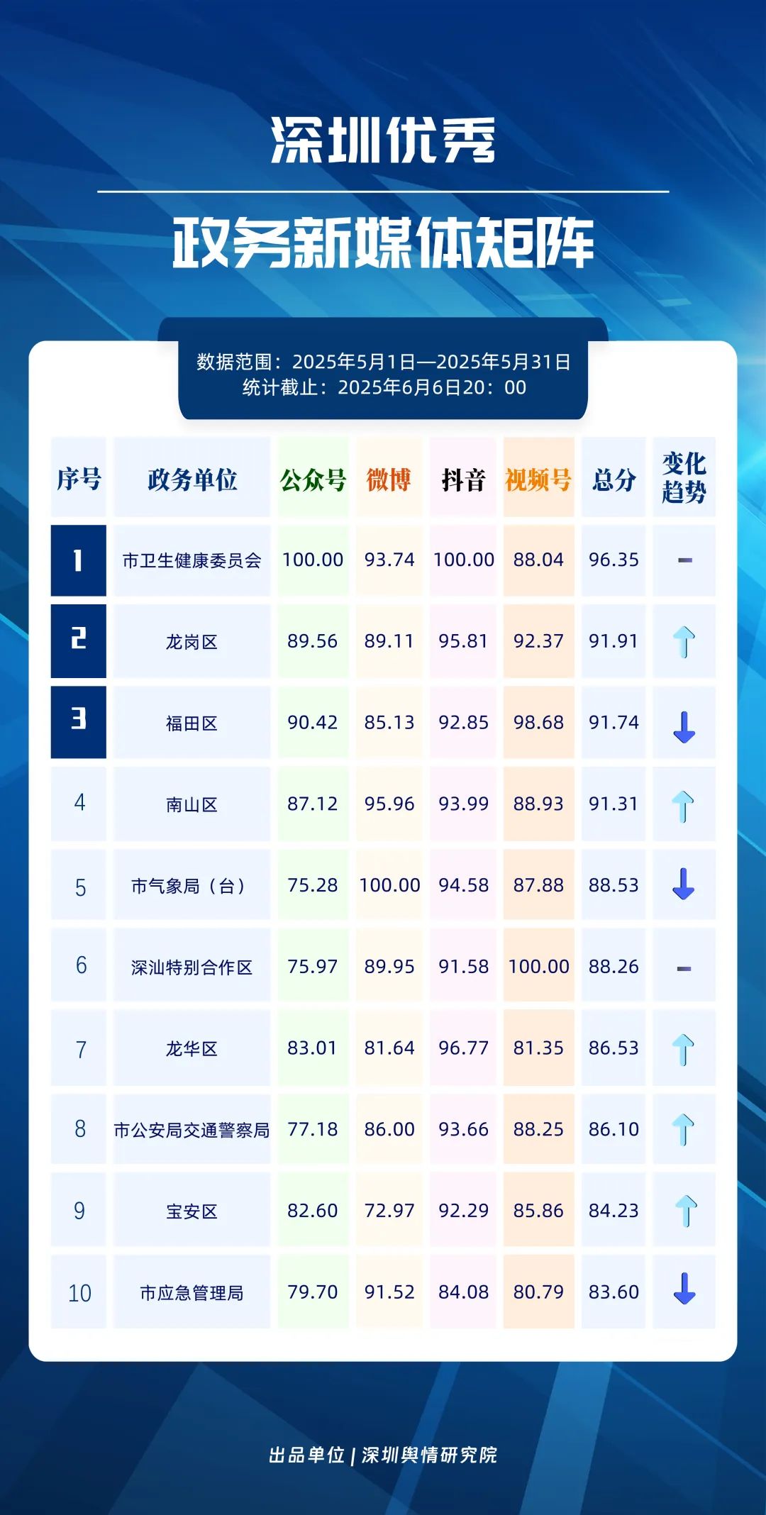 2025年5月期《深圳優(yōu)秀政務(wù)新媒體矩陣》發(fā)布,讓我們共同關(guān)注哪些矩陣以精準(zhǔn)傳播、智慧服務(wù)與創(chuàng)新實(shí)踐,在政務(wù)新媒體領(lǐng)域打造出具有示范價(jià)值的標(biāo)桿案例,以矩陣合力構(gòu)建政務(wù)傳播新生態(tài),為深圳城市網(wǎng)絡(luò)形象塑造持續(xù)注入新動(dòng)能。