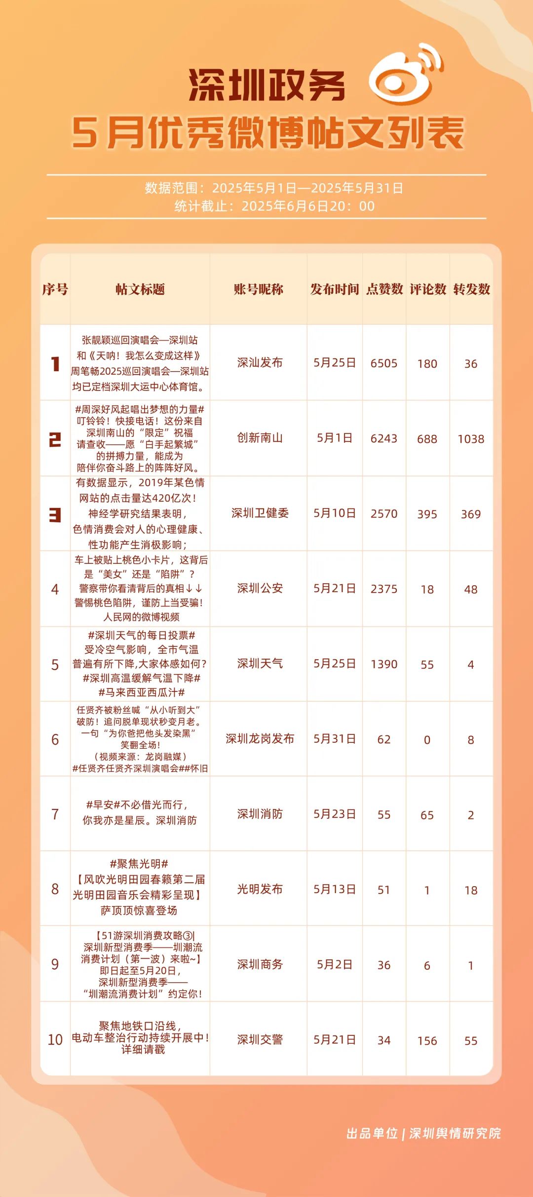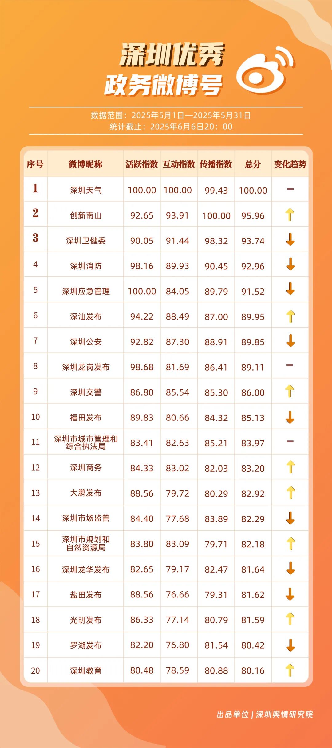 5月,“深圳天氣”“創(chuàng)新南山”“深圳衛(wèi)健委”“深圳消防”“深圳應(yīng)急管理”“深汕發(fā)布”“深圳公安”“深圳龍崗發(fā)布”“深圳交警”“福田發(fā)布”等20個(gè)賬號(hào)入選“優(yōu)秀政務(wù)微博號(hào)”。其中,“深圳天氣”憑借活躍指數(shù)和互動(dòng)指數(shù)雙項(xiàng)滿分的亮眼成績(jī),穩(wěn)居榜單首位?!皠?chuàng)新南山”以95.96分緊隨其后,在互動(dòng)、傳播指數(shù)得分大幅提升,排名實(shí)現(xiàn)顯著躍升?!吧钲谛l(wèi)健委”“深圳消防”“深圳應(yīng)急管理”也表現(xiàn)卓越,總分均超過(guò)90分,它們憑借權(quán)威信息發(fā)布、專(zhuān)業(yè)知識(shí)科普,展現(xiàn)了各單位在民生服務(wù)、公共安全領(lǐng)域的重要作用。以上優(yōu)秀政務(wù)微博號(hào)深度契合平臺(tái)的傳播特征,善于借助熱門(mén)話題擴(kuò)大影響力,以鮮明的賬號(hào)特色展現(xiàn)區(qū)域風(fēng)采。