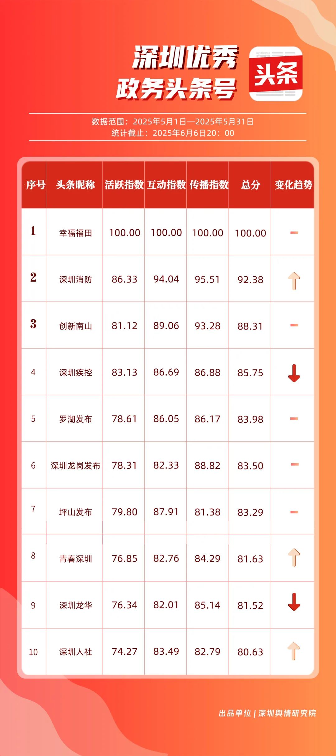 5月,“幸福福田”“深圳消防”“創(chuàng)新南山”“深圳疾控”“羅湖發(fā)布”“深圳龍崗發(fā)布”“坪山發(fā)布”“青春深圳”“深圳龍華”“深圳人社”共10個(gè)政務(wù)頭條號(hào)入選“優(yōu)秀政務(wù)頭條號(hào)”榜單。在榜單前三名中,“幸福福田”“創(chuàng)新南山”以穩(wěn)定且高質(zhì)量的內(nèi)容輸出,持續(xù)領(lǐng)跑,排名較上個(gè)月未發(fā)生變動(dòng)。位居榜單第二的“深圳消防”同樣表現(xiàn)亮眼,排名較上個(gè)月提升2個(gè)名次,充分展現(xiàn)了其在消防安全宣傳領(lǐng)域的持續(xù)深耕和創(chuàng)新突破。上榜政務(wù)頭條號(hào)各展所長(zhǎng),以?xún)?yōu)質(zhì)內(nèi)容為核心,充分發(fā)揮平臺(tái)傳播優(yōu)勢(shì),為政務(wù)信息的高效觸達(dá)與廣泛傳播樹(shù)立了標(biāo)桿。