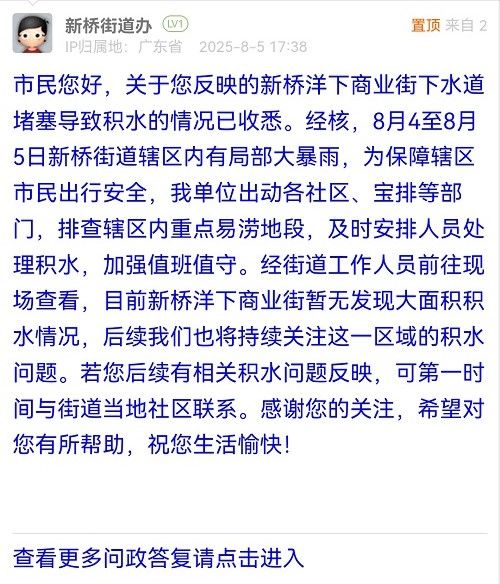 市民您好,關于您反映的新橋洋下商業(yè)街下水道堵塞導致積水的情況已收悉。經(jīng)核,8月4至8月5日新橋街道轄區(qū)內(nèi)有局部大暴雨,為保障轄區(qū)市民出行安全,我單位出動各社區(qū)、寶排等部門,排查轄區(qū)內(nèi)重點易澇地段,及時安排人員處理積水,加強值班值守。經(jīng)街道工作人員前往現(xiàn)場查看,目前新橋洋下商業(yè)街暫無發(fā)現(xiàn)大面積積水情況,后續(xù)我們也將持續(xù)關注這一區(qū)域的積水問題。若您后續(xù)有相關積水問題反映,可第一時間與街道當?shù)厣鐓^(qū)聯(lián)系。感謝您的關注,希望對您有所幫助,祝您生活愉快!