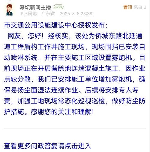 網(wǎng)友,您好!經(jīng)核實,該處為僑城東路北延通道工程盾構工作井施工現(xiàn)場,現(xiàn)場圍擋已安裝自動噴淋系統(tǒng),并在主要施工區(qū)域設置霧炮機。目前現(xiàn)場正在開展鑿除地連墻混凝土施工,因作業(yè)點較分散,我們已安排施工單位增加霧炮機,確保易揚塵面濕法連續(xù)作業(yè)。后續(xù)將安排專人專責,加強工地現(xiàn)場常態(tài)化巡視巡檢,做好防塵防護措施。感謝您的關注和理解!