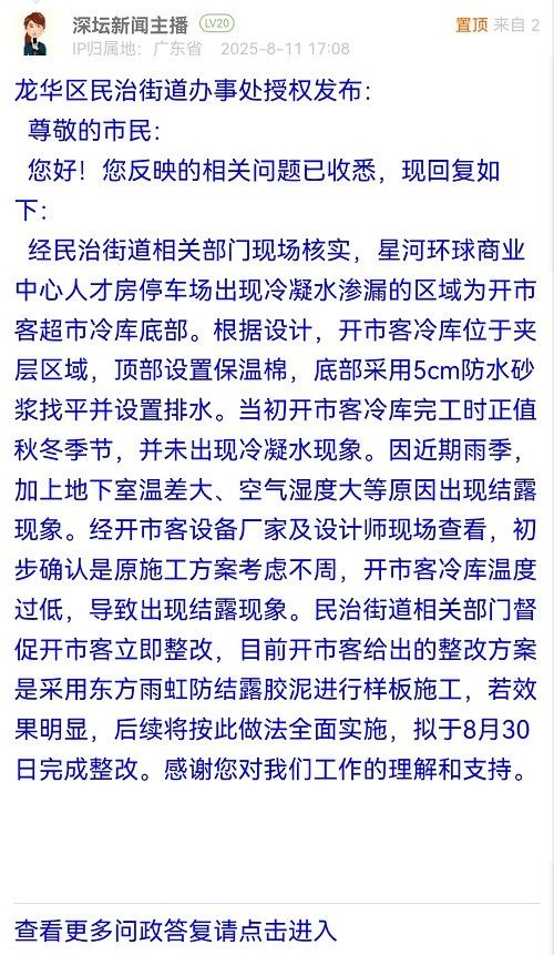 經(jīng)民治街道相關部門現(xiàn)場核實,星河環(huán)球商業(yè)中心人才房停車場出現(xiàn)冷凝水滲漏的區(qū)域為開市客超市冷庫底部。根據(jù)設計,開市客冷庫位于夾層區(qū)域,頂部設置保溫棉,底部采用5cm防水砂漿找平并設置排水。當初開市客冷庫完工時正值秋冬季節(jié),并未出現(xiàn)冷凝水現(xiàn)象。因近期雨季,加上地下室溫差大、空氣濕度大等原因出現(xiàn)結露現(xiàn)象。經(jīng)開市客設備廠家及設計師現(xiàn)場查看,初步確認是原施工方案考慮不周,開市客冷庫溫度過低,導致出現(xiàn)結露現(xiàn)象。民治街道相關部門督促開市客立即整改,目前開市客給出的整改方案是采用東方雨虹防結露膠泥進行樣板施工,若效果明顯,后續(xù)將按此做法全面實施,擬于8月30日完成整改。感謝您對我們工作的理解和支持。