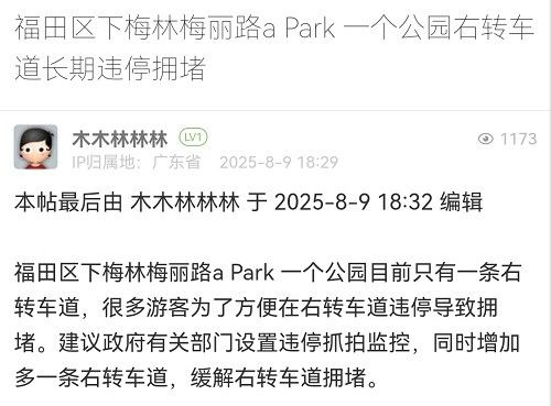 27. 帖文《福田區(qū)下梅林梅麗路a?Park?一個公園右轉車道長期違停擁堵》