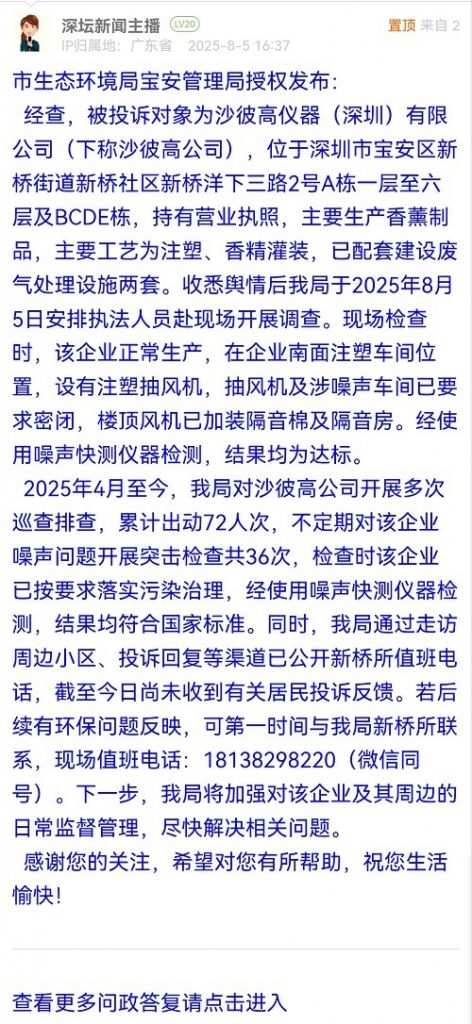 經(jīng)查,被投訴對象為沙彼高儀器(深圳)有限公司(下稱沙彼高公司),位于深圳市寶安區(qū)新橋街道新橋社區(qū)新橋洋下三路2號A棟一層至六層及BCDE棟,持有營業(yè)執(zhí)照,主要生產(chǎn)香薰制品,主要工藝為注塑、香精灌裝,已配套建設廢氣處理設施兩套。收悉輿情后我局于2025年8月5日安排執(zhí)法人員赴現(xiàn)場開展調(diào)查?,F(xiàn)場檢查時,該企業(yè)正常生產(chǎn),在企業(yè)南面注塑車間位置,設有注塑抽風機,抽風機及涉噪聲車間已要求密閉,樓頂風機已加裝隔音棉及隔音房。經(jīng)使用噪聲快測儀器檢測,結果均為達標。