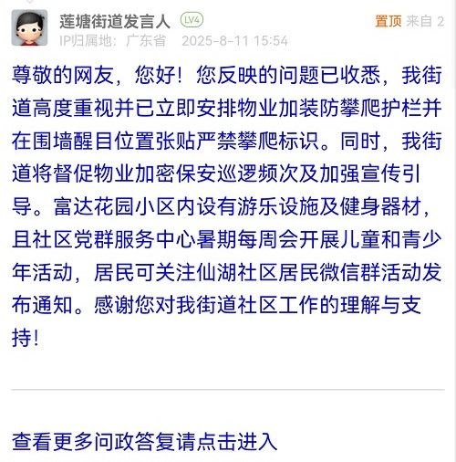 尊敬的網(wǎng)友,您好!您反映的問題已收悉,我街道高度重視并已立即安排物業(yè)加裝防攀爬護欄并在圍墻醒目位置張貼嚴禁攀爬標識。同時,我街道將督促物業(yè)加密保安巡邏頻次及加強宣傳引導。富達花園小區(qū)內(nèi)設有游樂設施及健身器材,且社區(qū)黨群服務中心暑期每周會開展兒童和青少年活動,居民可關注仙湖社區(qū)居民微信群活動發(fā)布通知。感謝您對我街道社區(qū)工作的理解與支持!