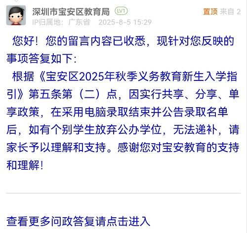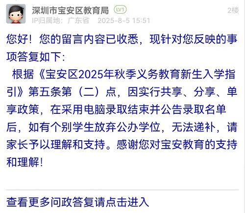 根據(jù)《寶安區(qū)2025年秋季義務教育新生入學指引》第五條第(二)點,因實行共享、分享、單享政策,在采用電腦錄取結束并公告錄取名單后,如有個別學生放棄公辦學位,無法遞補,請家長予以理解和支持。感謝您對寶安教育的支持和理解!
