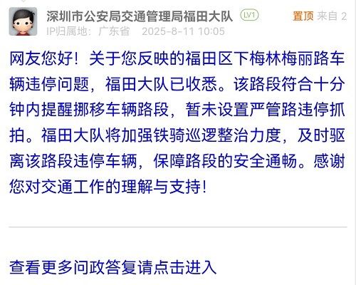 網(wǎng)友您好!關于您反映的福田區(qū)下梅林梅麗路車輛違停問題,福田大隊已收悉。該路段符合十分鐘內(nèi)提醒挪移車輛路段,暫未設置嚴管路違停抓拍。福田大隊將加強鐵騎巡邏整治力度,及時驅離該路段違停車輛,保障路段的安全通暢。感謝您對交通工作的理解與支持!
