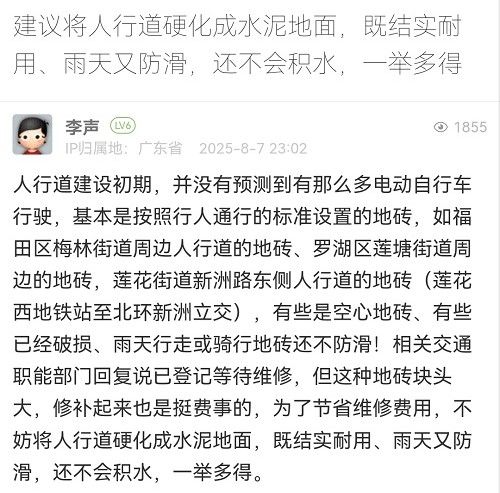 網(wǎng)友,您好!近年來,我們已對轄區(qū)內(nèi)部分電動自行車通行量較大的道路,試點采用拉絲混凝土工藝進行維修改造。下一步將結合年度養(yǎng)護計劃逐步推廣建設。感謝您的寶貴建議!