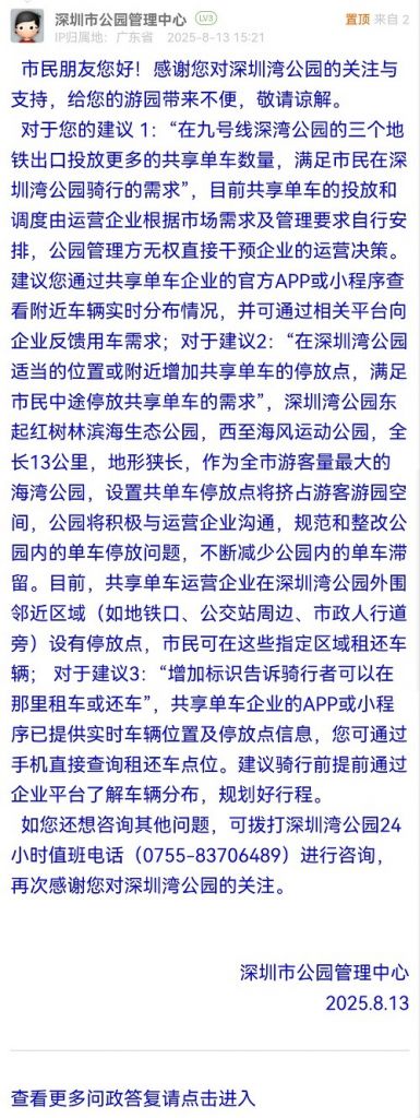 對于您的建議 1:“在九號線深灣公園的三個地鐵出口投放更多的共享單車數(shù)量,滿足市民在深圳灣公園騎行的需求”,目前共享單車的投放和調(diào)度由運營企業(yè)根據(jù)市場需求及管理要求自行安排,公園管理方無權直接干預企業(yè)的運營決策。建議您通過共享單車企業(yè)的官方APP或小程序查看附近車輛實時分布情況,并可通過相關平臺向企業(yè)反饋用車需求;對于建議2:“在深圳灣公園適當?shù)奈恢没蚋浇黾庸蚕韱诬嚨耐7劈c,滿足市民中途停放共享單車的需求”,深圳灣公園東起紅樹林濱海生態(tài)公園,西至海風運動公園,全長13公里,地形狹長,作為全市游客量最大的海灣公園,設置共單車停放點將擠占游客游園空間,公園將積極與運營企業(yè)溝通,規(guī)范和整改公園內(nèi)的單車停放問題,不斷減少公園內(nèi)的單車滯留。目前,共享單車運營企業(yè)在深圳灣公園外圍鄰近區(qū)域(如地鐵口、公交站周邊、市政人行道旁)設有停放點,市民可在這些指定區(qū)域租還車輛; 對于建議3:“增加標識告訴騎行者可以在那里租車或還車”,共享單車企業(yè)的APP或小程序已提供實時車輛位置及停放點信息,您可通過手機直接查詢租還車點位。建議騎行前提前通過企業(yè)平臺了解車輛分布,規(guī)劃好行程。