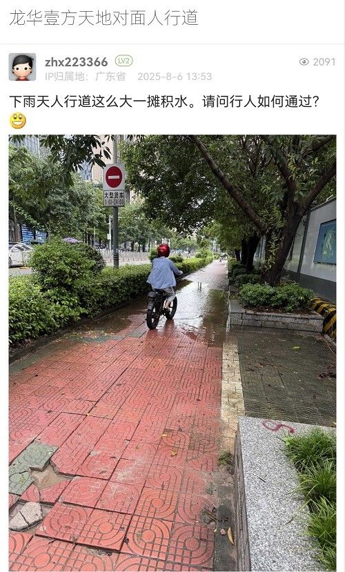 21. 帖文《建議將人行道硬化成水泥地面,既結實耐用、雨天又防滑,還不會積水,一舉多得》