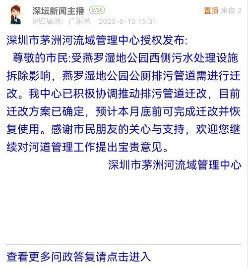 尊敬的市民:受燕羅濕地公園西側污水處理設施拆除影響,燕羅濕地公園公廁排污管道需進行遷改。我中心已積極協(xié)調(diào)推動排污管道遷改,目前遷改方案已確定,預計本月底前可完成遷改并恢復使用。感謝市民朋友的關心與支持,歡迎您繼續(xù)對河道管理工作提出寶貴意見。
